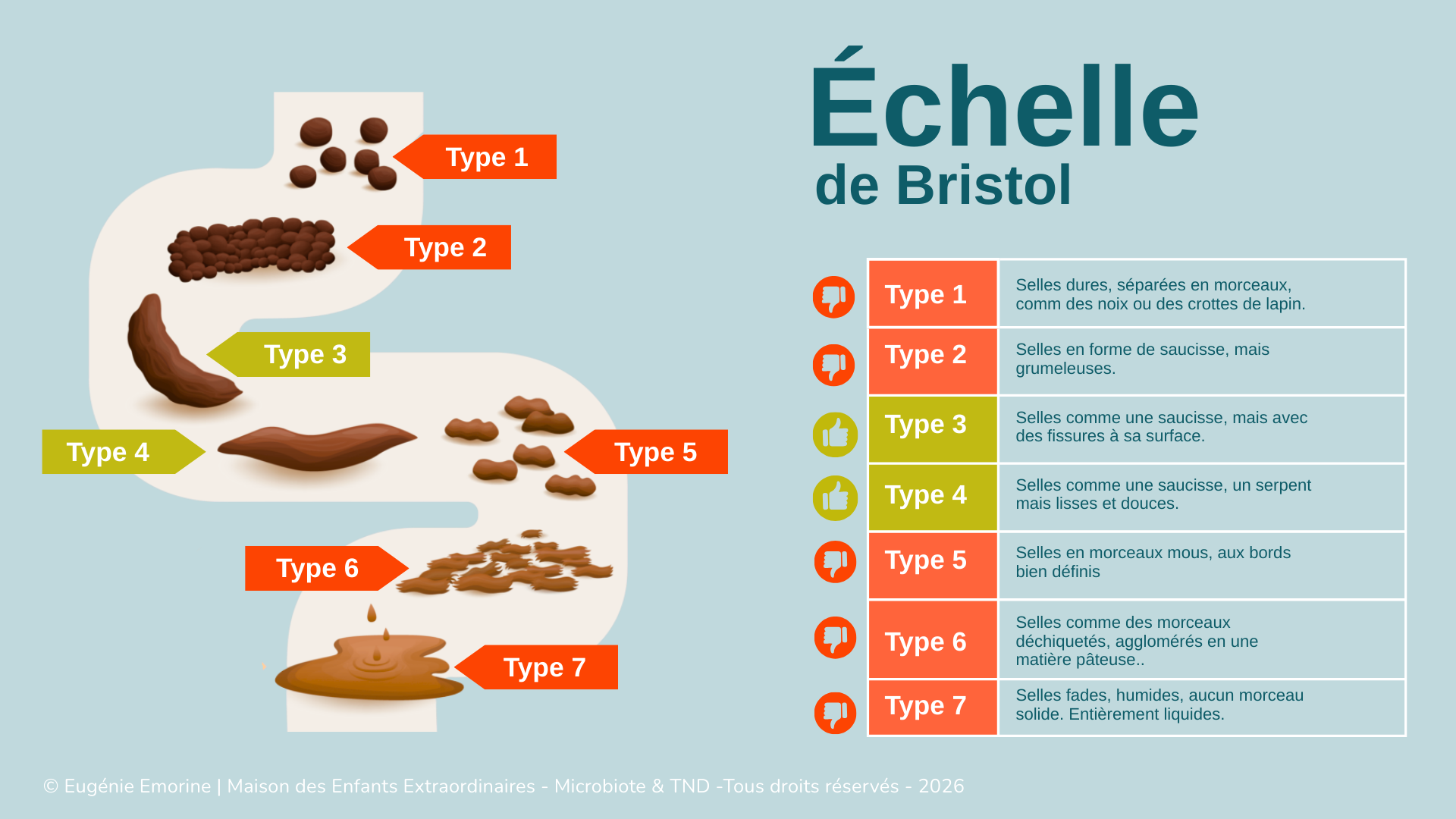 Un outil simple peut aider la famille : l’échelle de Bristol. Affichée dans les toilettes, elle permet d’observer l’aspect des selles sur deux à trois semaines. Les types 3 et 4 correspondent généralement à un transit équilibré ; les types 1 et 2 évoquent une constipation.